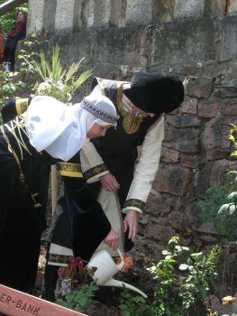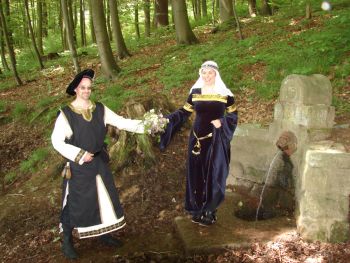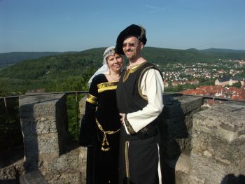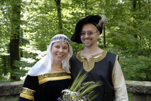 Münden. Da uns bekannt war, dass wir voraussichtlich die "Trausaison" 2007 auf der Tillyschanze eröffnen würden, sollte auch die Trauung etwas Besonderes werden. Wir entschieden uns, in mittelalterlicher Kleidung zu heiraten, und waren das 25. Brautpaar, das sich in Hann. Münden im Jahre 2007 das JA-Wort gab - und tatsächlich das erste auf der Tillyschanze in diesem Jahr. Musikalisch begleitet wurde die Zeremonie von Herrn Harald Kramer, der ebenfalls stilecht gekleidet war und uns mit den Klängen aus seiner Harfe verzauberte. Unser Standesbeamter, Herr Hans-Jürgen Kempel, trug (Liebes-)Gedichte vor - beginnend bei Walter von der Vogelweide bis hin zu Freud. Nach der Trauung überraschte er uns mit einem Regen aus Rosenblättern, den er "bestellt" hatte und der auf uns herabsank, nachdem uns Herr Kempel auf einen Balkon neben dem Treppenaufgang im Turm der Tillyschanze gelockt hatte. |