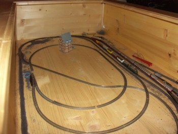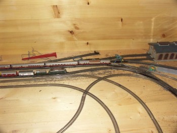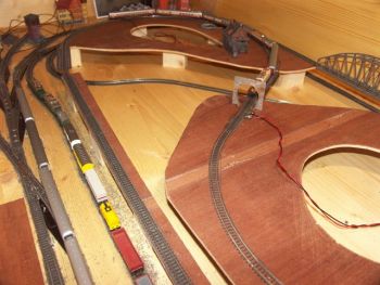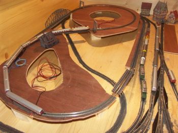 Inzwischen ist auch der Bau der Bergstrecke vorangekommen. Diese überquert über drei Brücken die untere Gleisanlage. Abweichend vom Gleisplan Dr. Königs gibt es nur einen Tunnel, der die Wendeschleife verdeckt |