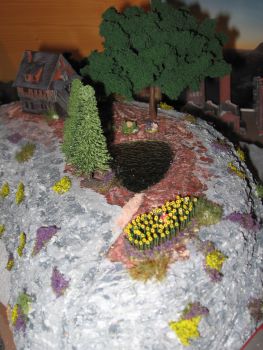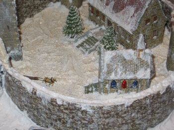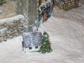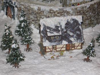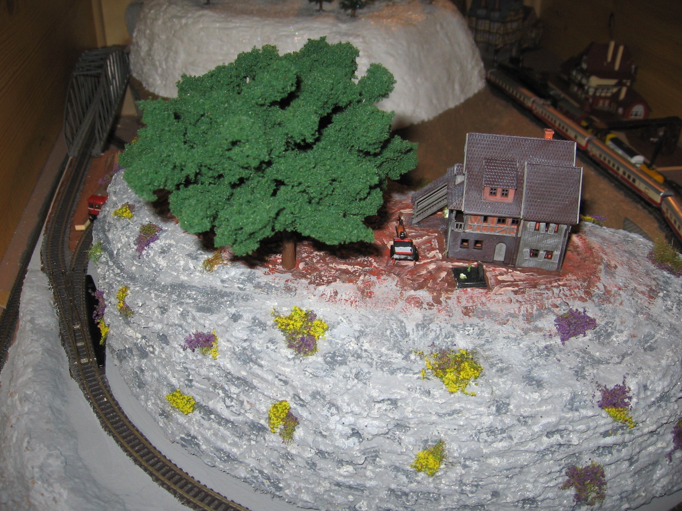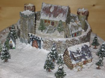 Der Burgberg (auf der "Insel mit zwei Bergen") wird in Form einer tief verschneiten Winterlandschaft, die im Licht glitzert, gestaltet. Den Glitzereffekt erzielten wir durch Aufstreuen des Glitzerschnees von Auhagen sowie eines Speziallackes. Während das Gelände um die Bergkirche (mit dem beleuchteten Weihnachtsbaum !) bereits fertig ist, müssen die Bäume noch gepflanzt und das Gelände um die "Skihütte" noch gestaltet werden. Außerdem fehlen noch die Lummerlandbewohner. | |