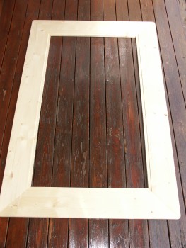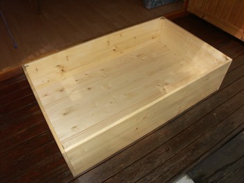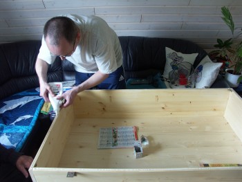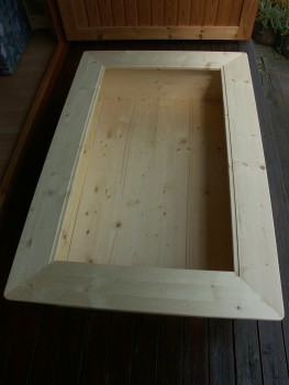 Der Tisch besteht aus einer Grundplatte mit den Maßen 120 cm x 70 cm. Die Seitenwände sind ca. 30 cm hoch, sodass wir eine Bauhöhe von ca. 25 cm haben. Oben befindet sich ein Rahmen, der zusammen mit einer Glasplatte eines Tisches aus einem großen schwedischen Möbelhaus die Tischplatte bildet. | |